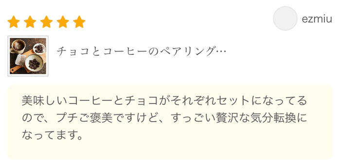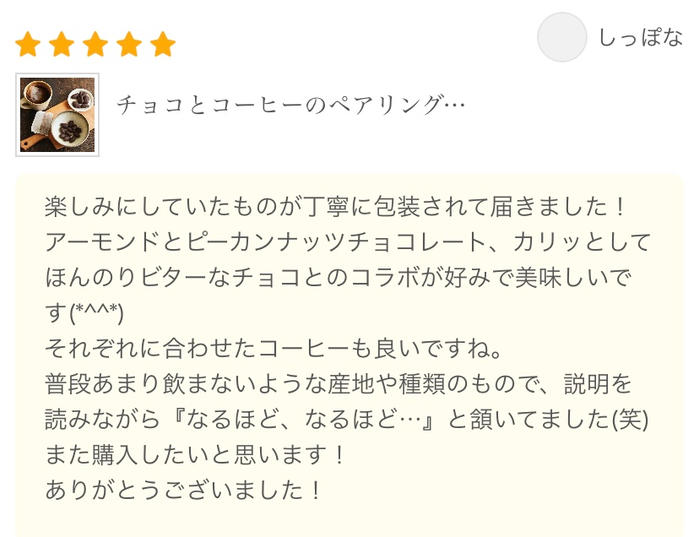 - 今回「Creema SPRINGS」限定として、紅茶を思わせる甘さとなめらかな口当たりがたのしめる、チョコレートに合うカフェインレスコーヒーをご支援者さま全員にプレゼント致します。「ひとくち -HITOKUCHI-」の新しい味をぜひお試しください!