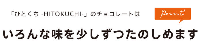- 「高級チョコレートを、日々の暮らしのひとくちとしてたのしめるように、お手軽な価格で提供したい」という創業者 荻曽友貴の想いから、「ひとくち -HITOKUCHI-」ブランドは誕生しました。