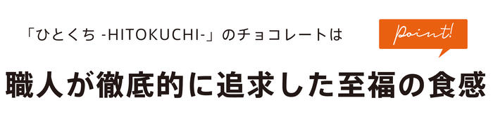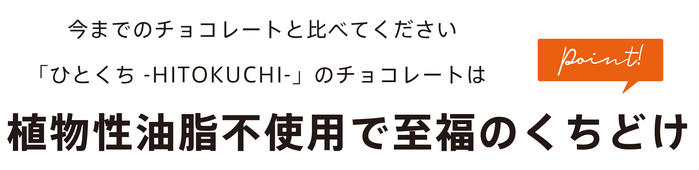 私達「ひとくち - HITOKUCHI -」のチョコレートも、高級チョコレート原料のみを使用しており、くちどけ感を落としてしまう植物性油脂は使用していません。 -