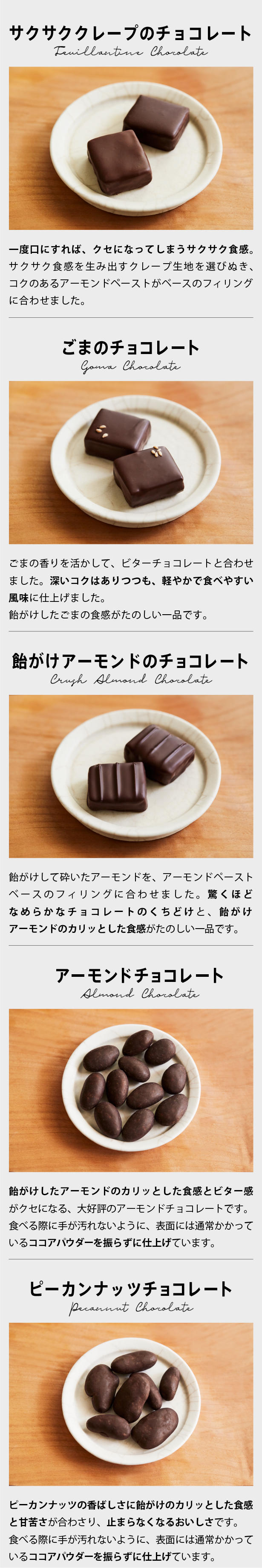 - 職人が温度を0.1度単位で調整することで、ベストなくちどけ感を作り上げました。チョコレートに合わせる素材を活かしたひとつひとつ異なる食感で、また食べたくなる印象的な味わいです。