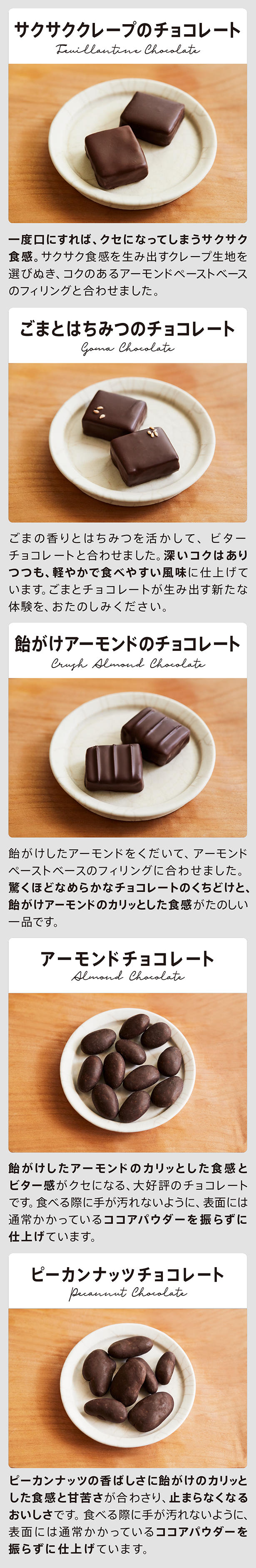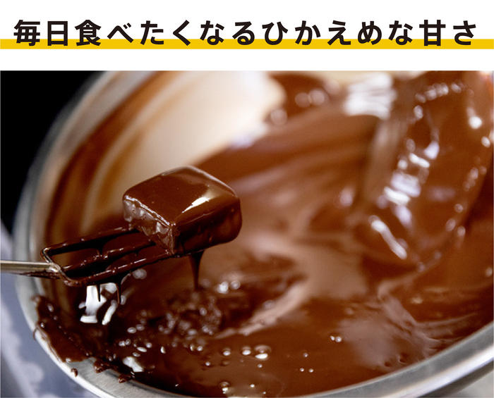 - 職人が温度を0.1度単位で調整することで、ベストなくちどけ感を作り上げました。チョコレートに合わせる素材を活かした、ひとつひとつ異なる食感で、また食べたくなる印象的な味わいです。