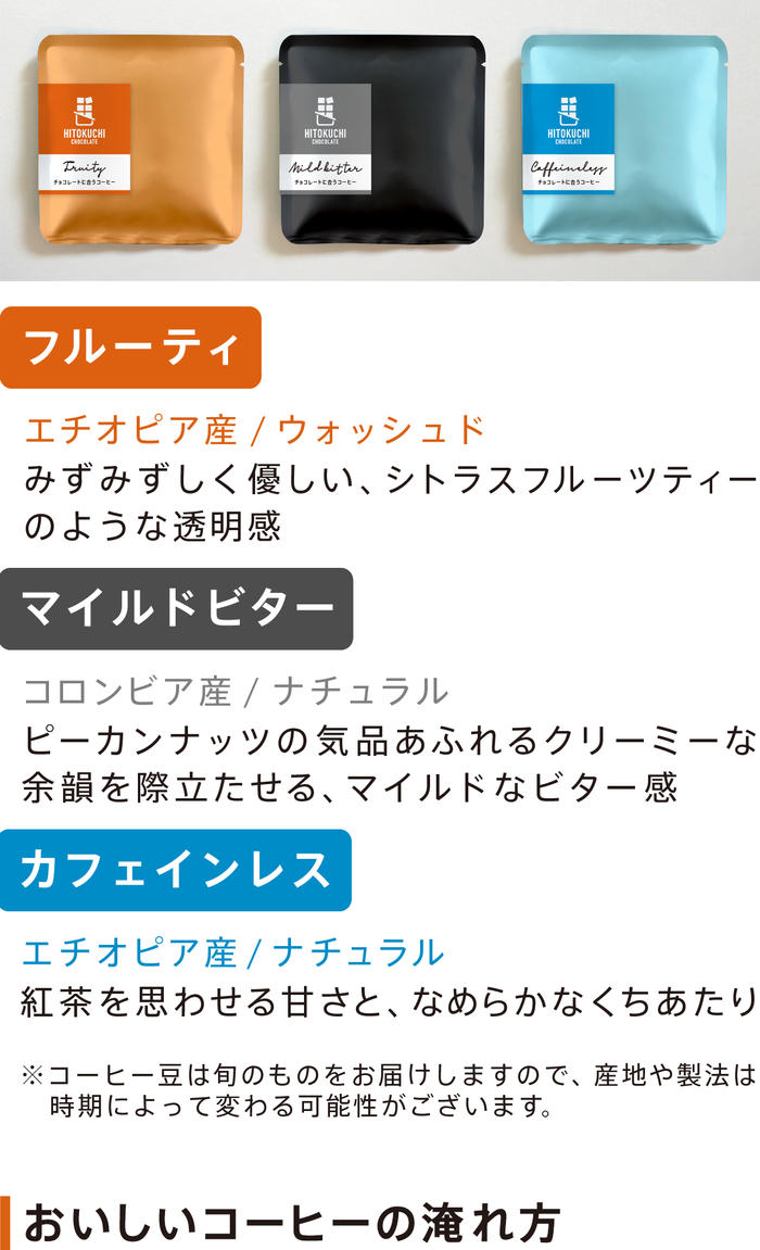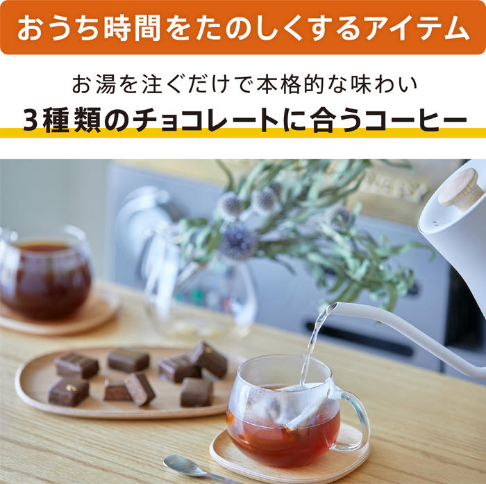 - ご自宅での時間をよりたのしく過ごしていただけるよう、チョコレートを引き立たせるコーヒーをご用意しました。