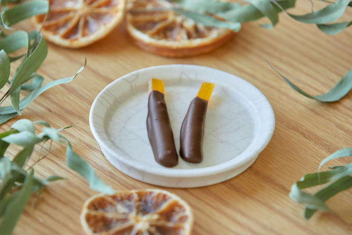 - コーヒーなどの飲み物と一緒にたのしめるように、ビターめな河内晩柑ピールにバランスを合わせて、ミルクチョコレートでコーティングしました。