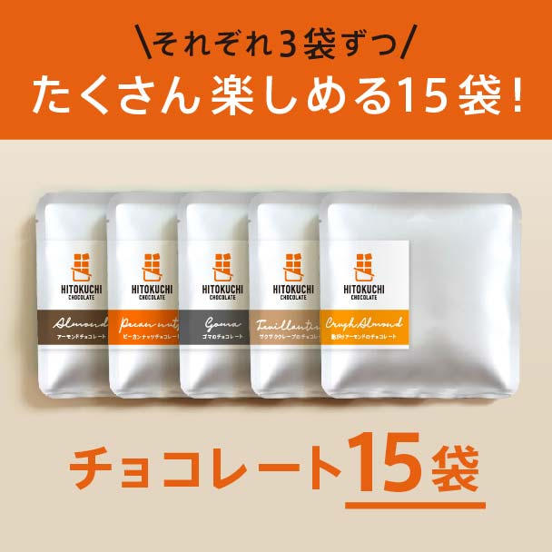 - 3倍たのしめる15袋セット!チョコレート5種アソートでお届け。