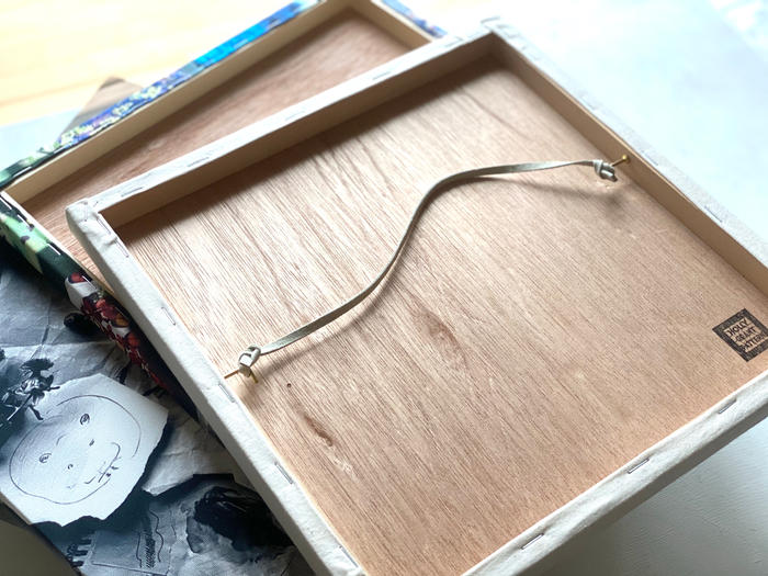 壁面にもフックひとつで簡単に飾れるように、裏に金具と紐を取り付けた状態でお届けする予定です。画鋲やピンを2個平行に壁に挿し、パネルのフレーム部分を直接引っ掛けるだけでも飾れます。