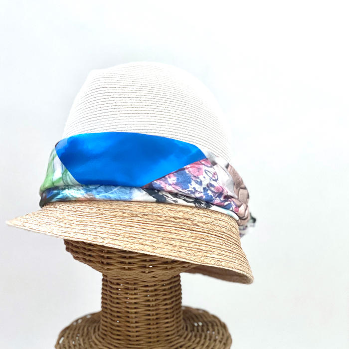 ハットやバッグの持ち手に巻きつけてポイントにしていただいたりと、使い方は無限大の大きめスカーフです。