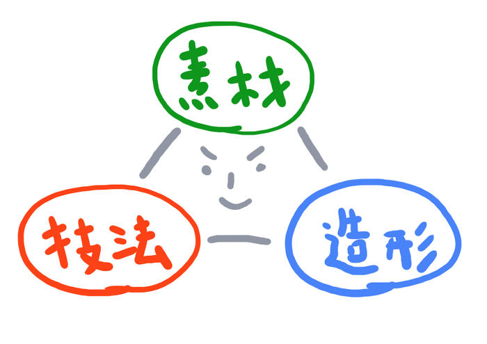 - まじめな話になるのですが、私は大学で金属工芸を学んでいました。工芸においては「素材」「技法」「造形」の三点のバランスであると私は考えています。そして工芸とはその三点をもって最終的には日常の道具を作ること、即ち生活・文化の役に立つことを目的にしています。
