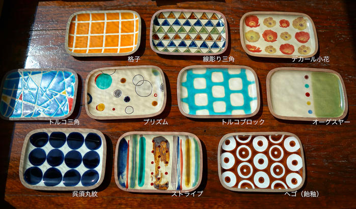 呉須(紺色)、紫、ベージュ(キビ灰)、飴釉の計9色ございます。 -