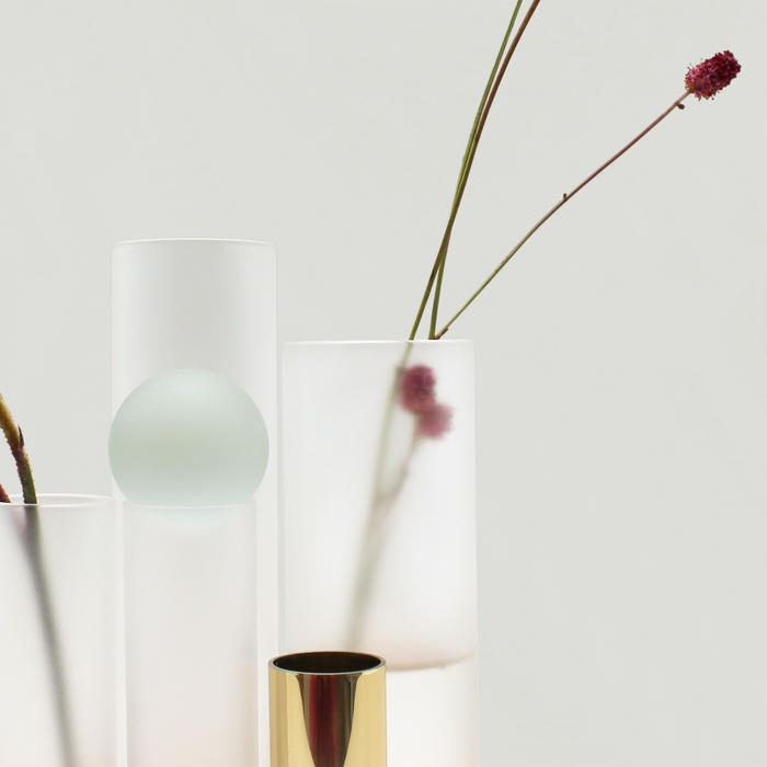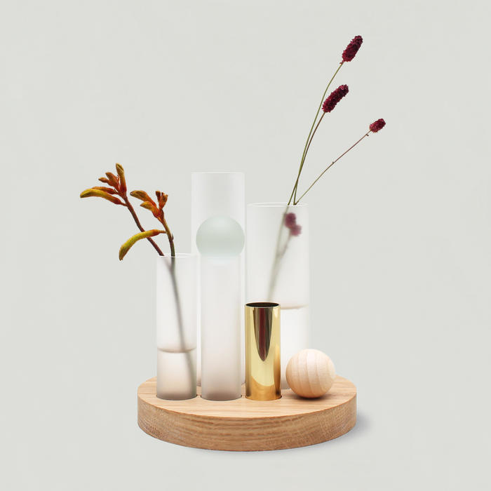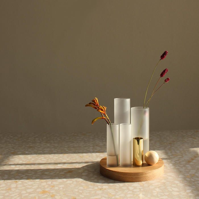 それぞれ高さと奥行きが異なるガラス瓶に一輪挿し感覚でお花を生けるだけで、簡単に詩的な生け花を楽しめます。