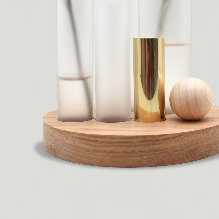 また、木材パーツには小さなくぼみが一箇所あり、写真のようにくぼみ部分やガラス瓶の上に付属の木球やガラス玉を置いて、ご自由にアレンジすることができます。