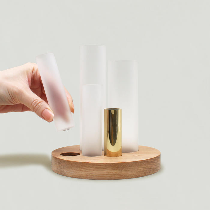 ガラス瓶の底と木材パーツの穴部分にマグネットが付いており、ガラス瓶と真鍮パイプを差し込んで、磁石で固定させるタイプの花器です。ガラスと真鍮パーツはそれぞれ取り外し可能となっております。