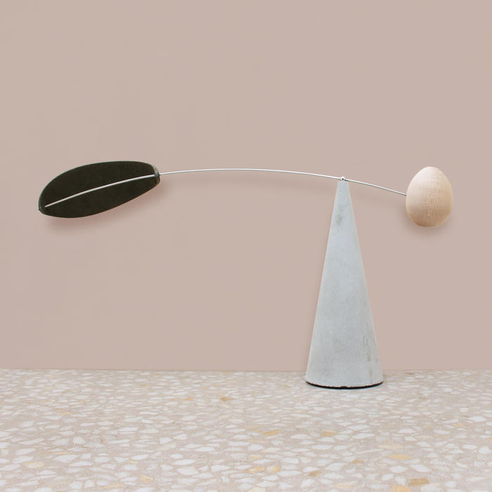 台座の窪みにパーツを載せていただくと、空調の風が当たる場所や人が近くを通るところでは、水平方向にゆっくりくるくると、上下にも少しゆらゆら揺れます。