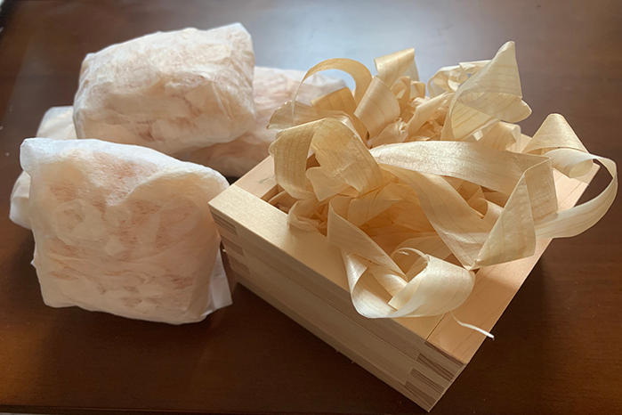 - 組子細工を作る際に出てくる、木を削ってできたかんなくずを袋に詰め込みました。