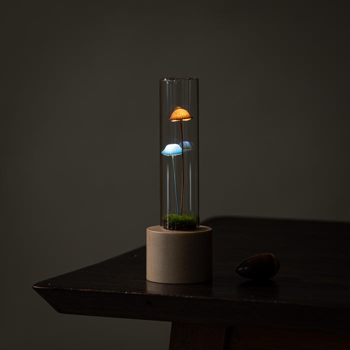 素材:きのこ 樹脂 / 上部 ガラス / 台 木製