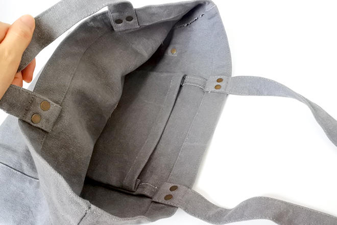 - シンプルなバッグですが、両サイドに付いているポケットと飾りのスタッズで、ただのトートバッグとはひと味違うカッコよさが出ています。