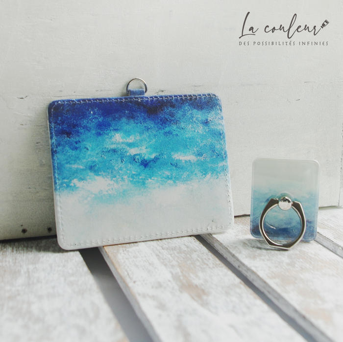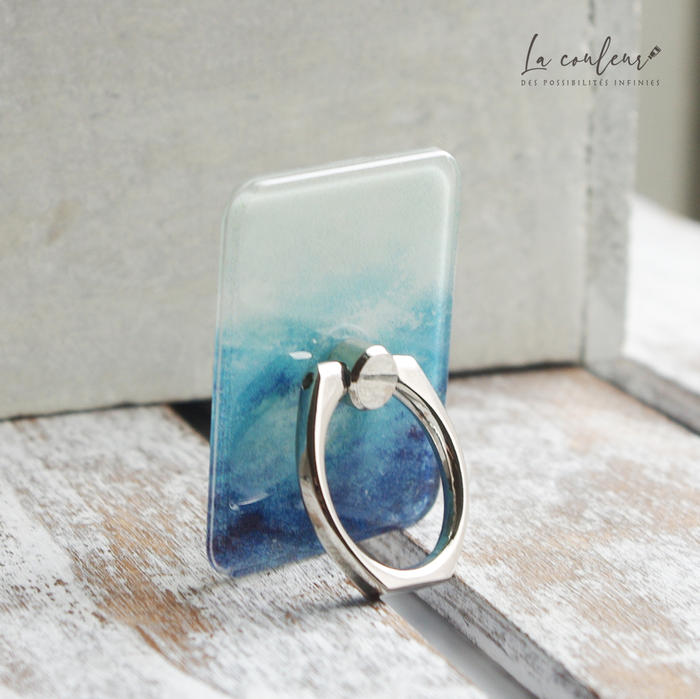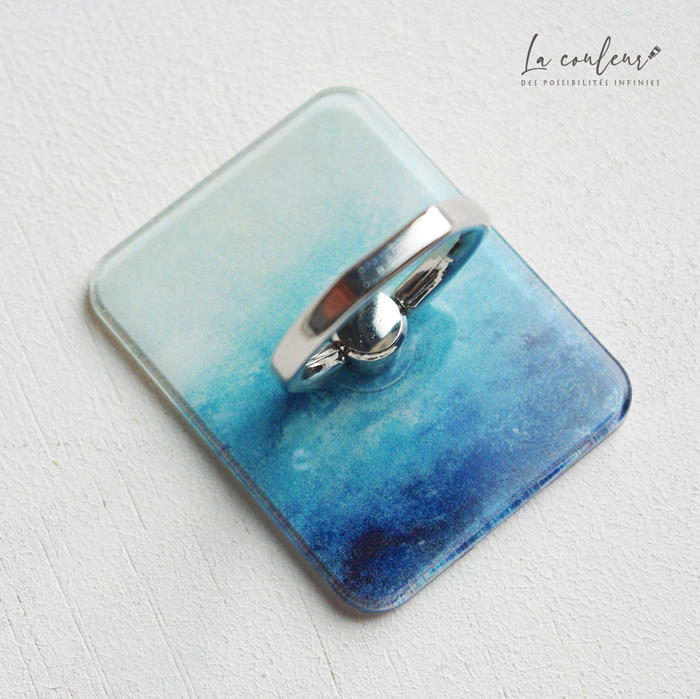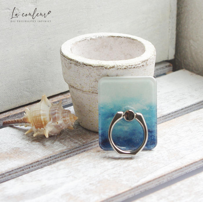 - スマートフォンやタブレット端末に貼り付けて装着しリングに指を通すと、
