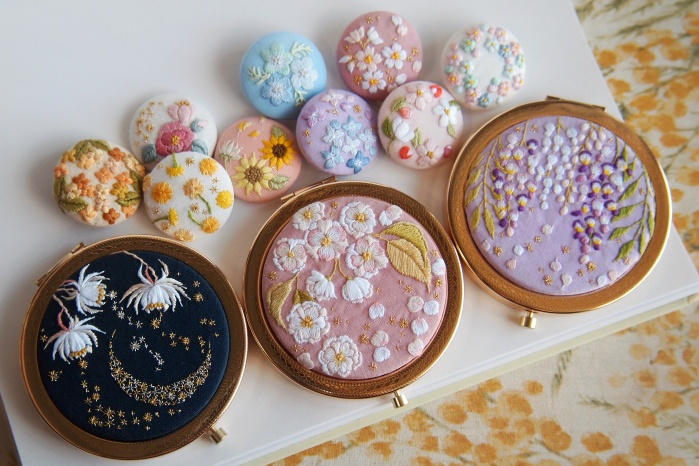 - また、コンパクトミラーに関しては3柄ともに今回のクラウドファンディング限定デザインです!これまでコツコツと身に着けてきた刺繍の技術を振り絞って、精いっぱい製作しました。是非多くの方に手に取って頂きたい作品です。
