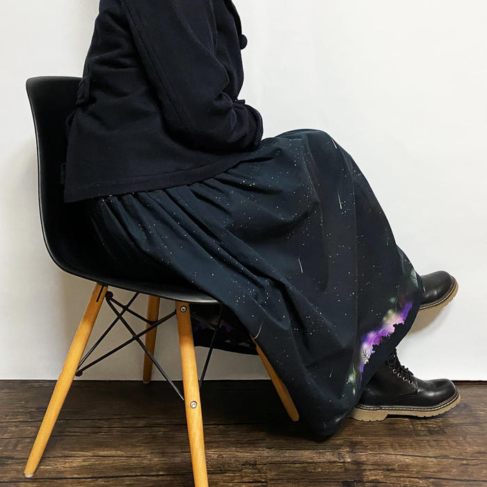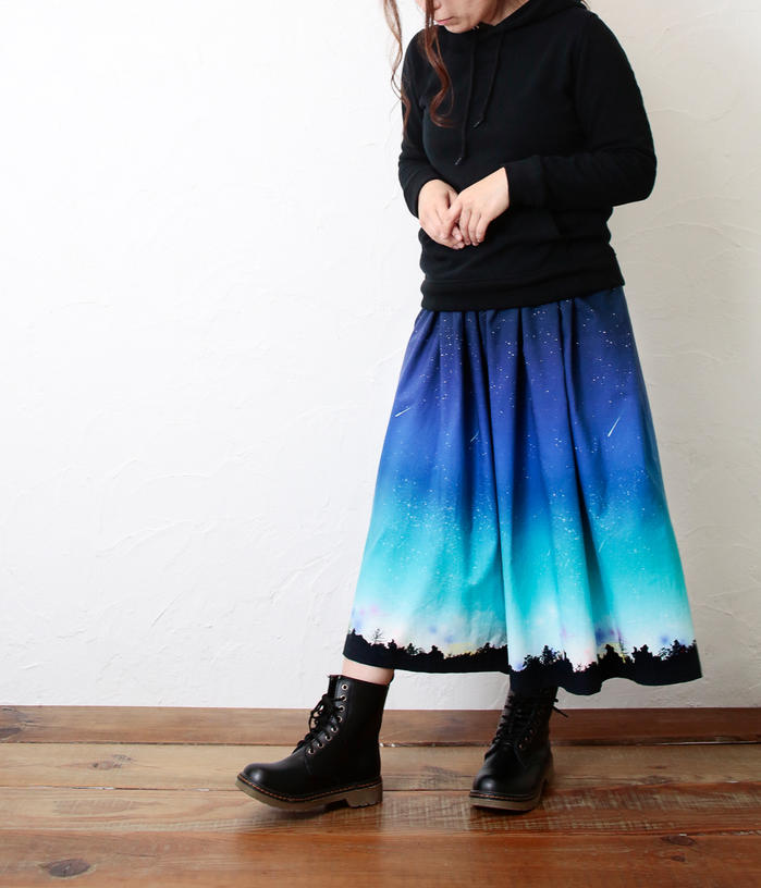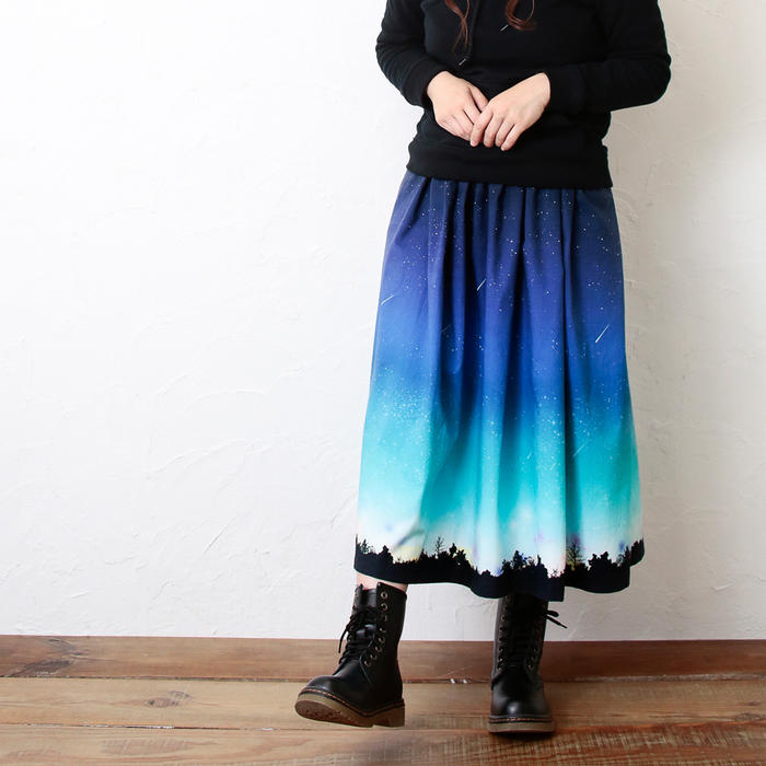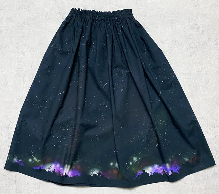 - 流星柄を全面にプリントした流星柄大人用ギャザースカートです。