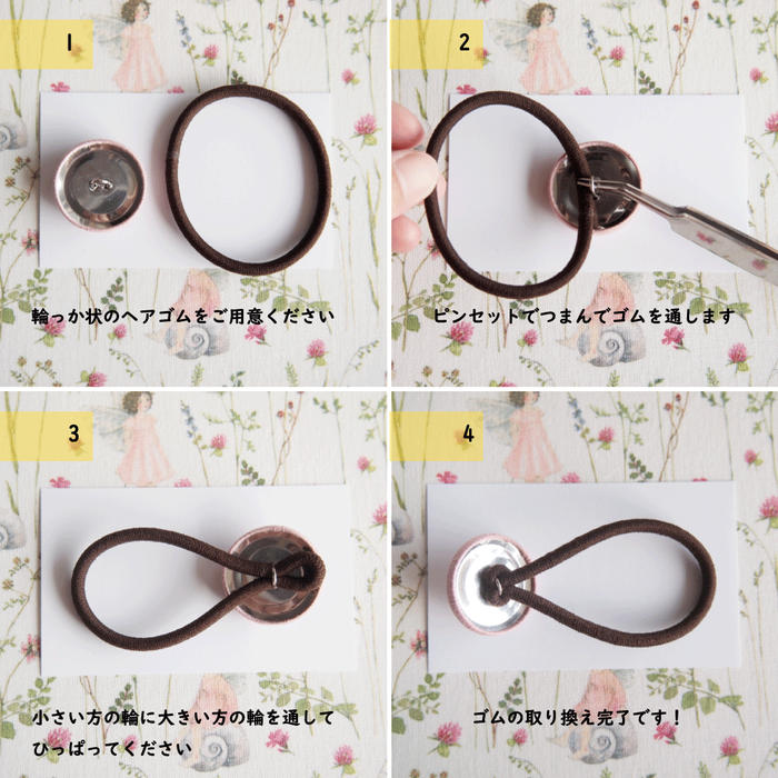 - ヘアゴムの色は茶色です。日本製の丈夫なヘアゴムを使用しています。とはいえ時間の経過とともに起きる劣化は避けられません。長くお使い頂くために、ご自身でゴムの交換をして頂ける仕様となっております。下記画像を参考にして頂けましたら幸いです。