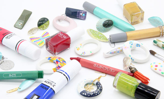 - 100円ショップのマニキュアがオススメです!かなりの品種が置いてありますし、クオリティの高いアクセサリーの製作ができますよ。イメージ写真で使用したマニキュアは全て100円ショップの製品を使用させていただきました。