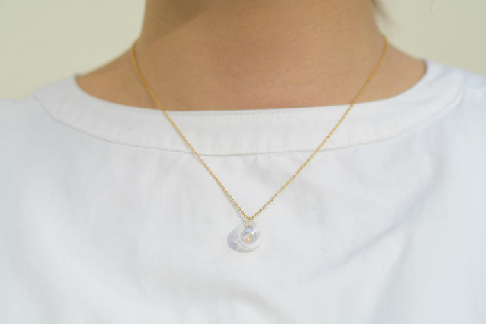 シャボン玉というと少し幼さを感じるイメージがありますが、直径約12mmという少し小ぶりなサイズにすることでパールジュエリーの様な上品さを演出しました。
