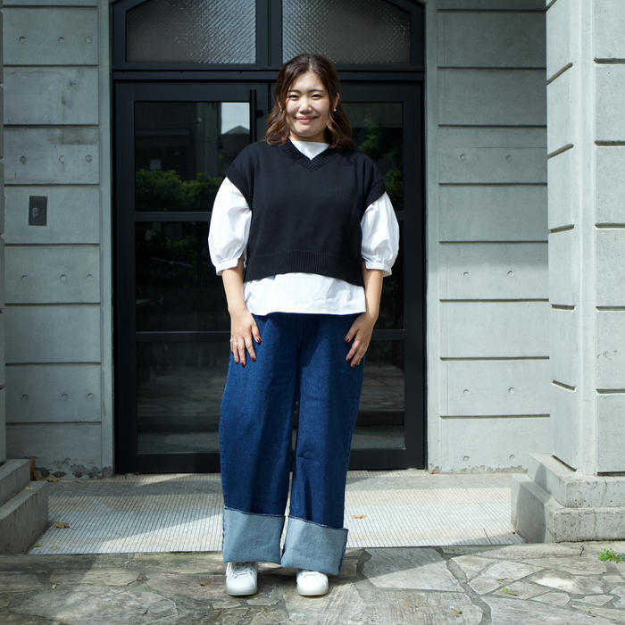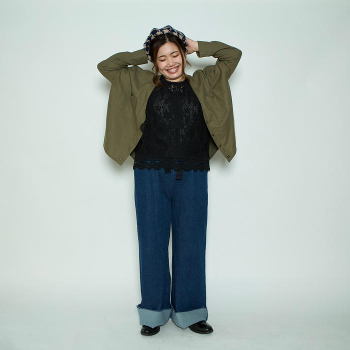 ジャケット、Tシャツ、ニットどんなトップスにも合う。
