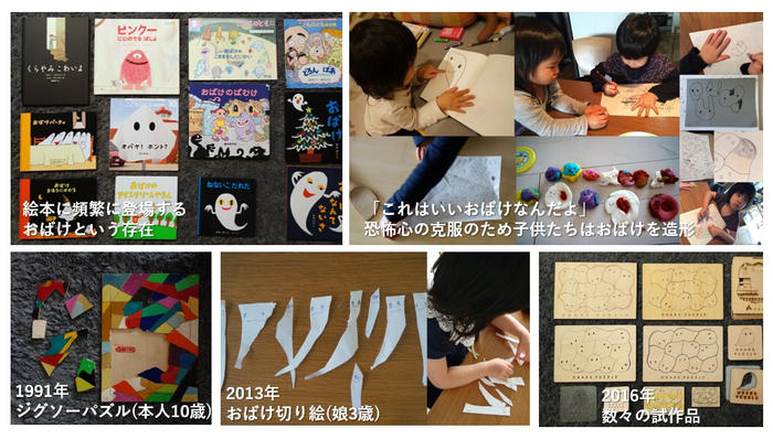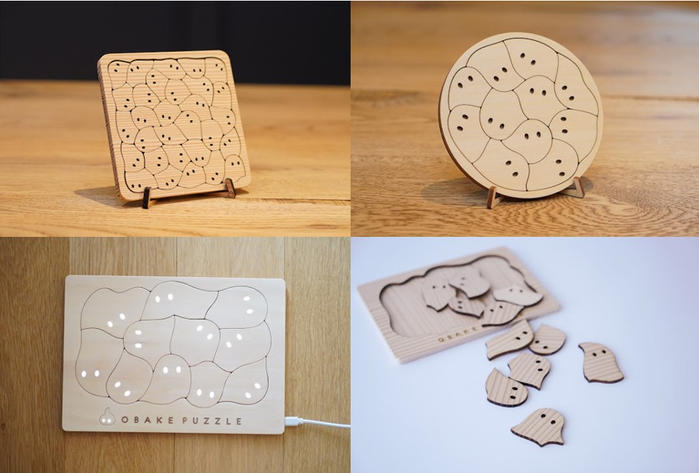 これらとともに、娘の作ったおばけの切り絵をヒントにし2016年にデザイン山田のかわいらしいおばけのスケッチと、デジタルファブリケーションの環境が揃い、精密なカット加工が容易に可能になり実際に製作出来たこと、数々の試作品を経て現在のおばけのフォルムや顔立ち、おばけパズルの世界ができあがり、子供たちにも好評を得ています -