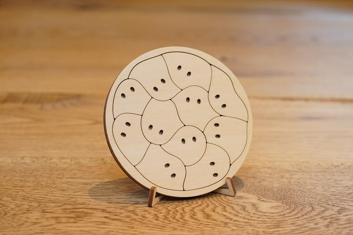 たった11ピースだけど、目に穴があいていて表裏がわからないから、むずかしいよ。 30人にやってもらって、平均は6分。いちばん時間がかかった人は15分。 でも、なれてくると4歳の最速タイムは33秒だよ。