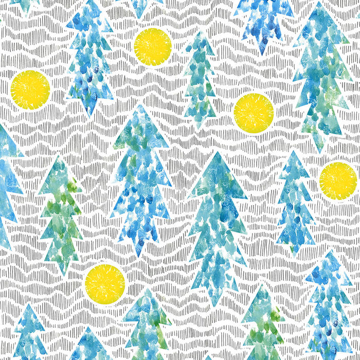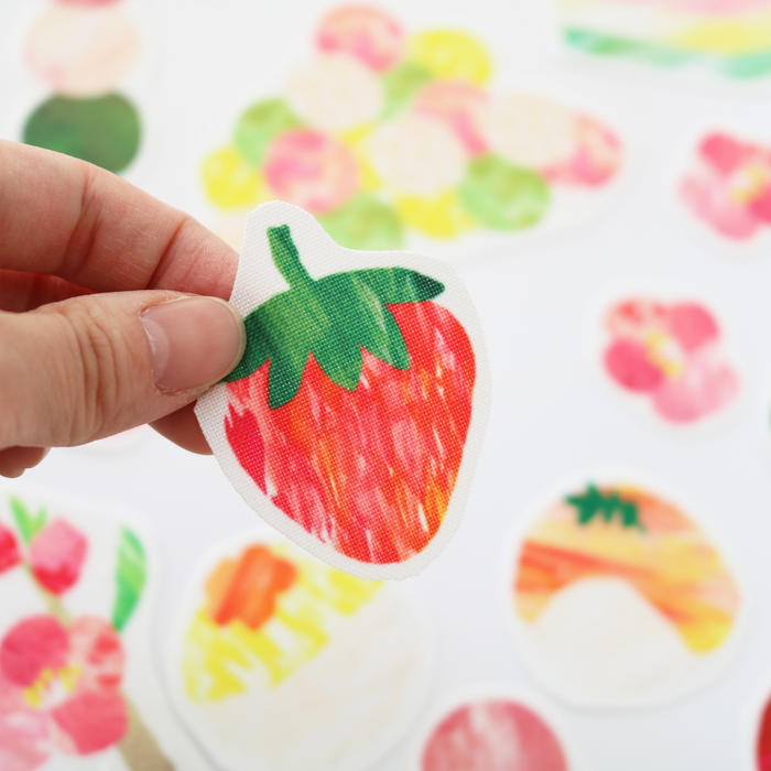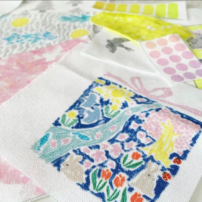 - 絵の具で画用紙に色をのせ、スキャンしてデータ化したものをパソコン上で切り抜き、ひとつの柄に仕上げています。手描きならではの独特の筆跡や濃淡が出るのが面白いところです。