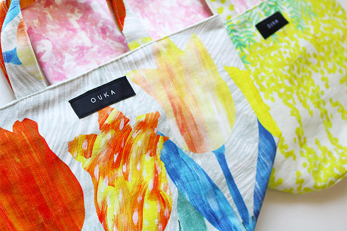 - ブランド名のOUKA(おうか)は、人生を謳歌してほしいという想いを込めて名付けました。手描きを元に描き上げたウキウキするプリント生地で、タペストリーや布雑貨をお作りしています。