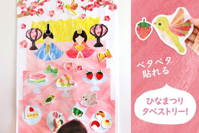 - 春の訪れを感じる行事といえば3月3日のひな祭り。高価なひな人形は大事に飾って眺めるだけになりがちですが、もっと気軽に遊びながら飾れたら、大人もこどもも楽しめるのでは?そんな考えから企画したペタペタ貼れるひな祭りタペストリー。