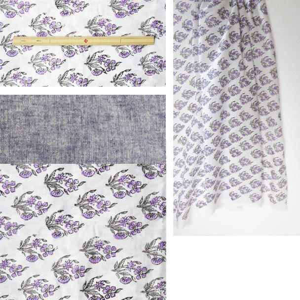 ジパン(柄88・どこまでも優しい紫色の小花模様とナス紺ベルギーリネン糸を使った綿麻布のコンビ)+つけ里、半襟、カタログ、ポストカード。