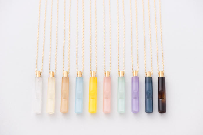 必要だとわかってはいても、なかなか持ち歩くことのできない防災用の笛。でももしアクセサリー感覚で身につけられるものがあったら、万が一の時により多くの命を助けることができるのでは…。めがねの素材から生まれた、身につける人に寄り添う、お守りのような笛をつくっています。