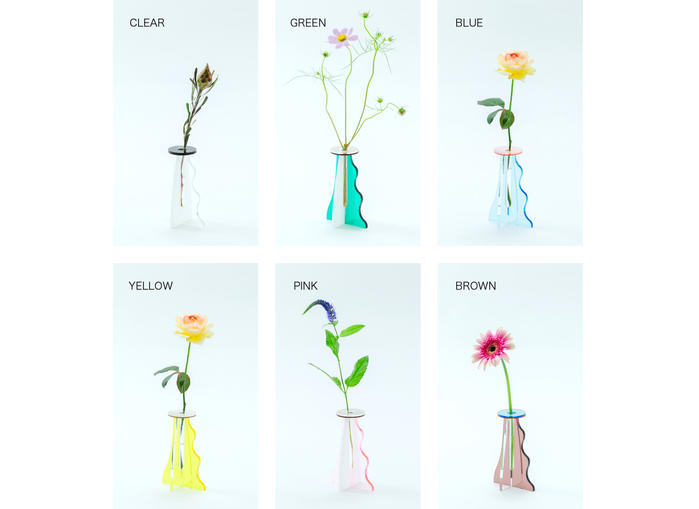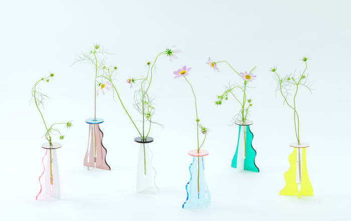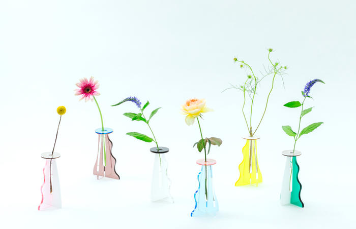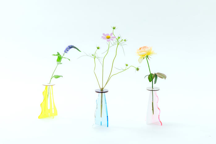 もちろん、お花を引き立てる色味でまとめることもできますが、わたしたちplyingはアクリルのカラフルな美しさも一緒にたのしんでもらいたい。アクセサリーに限らず、一輪挿しでもその想いは同じです。