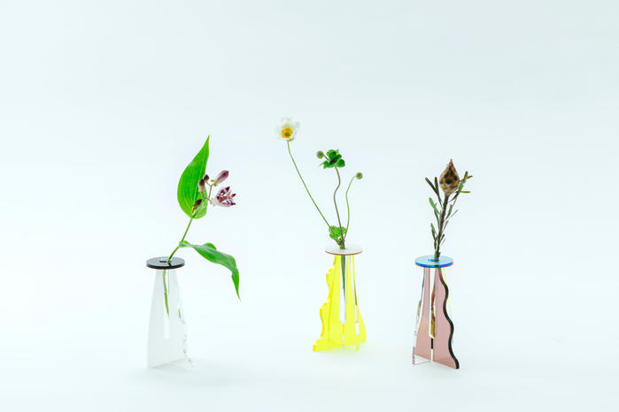 - ICHIRIN VASEはアクリルと木材、ガラス管の合計5つのパーツでつくる組み立て式の一輪挿しです。