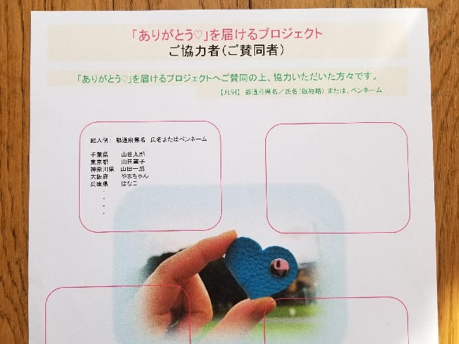 今回、ご支援いただいた皆さまの都道府県名、氏名/ペンネームを記載したご協力者一覧をハートクリップと共にお渡しします。