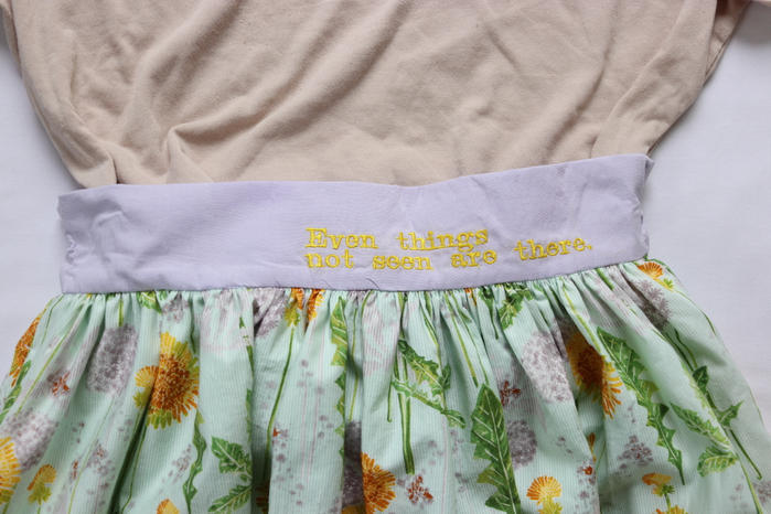 金子みすゞの詩からインスピレーションを受けたという生地を使用し、メッセージ刺繍で彩るママのスカート
