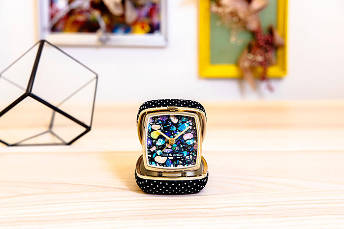 - 貝殻とアートを融合した‟螺鈿アート”というオリジナル技法を使ったインテリアクロックです。