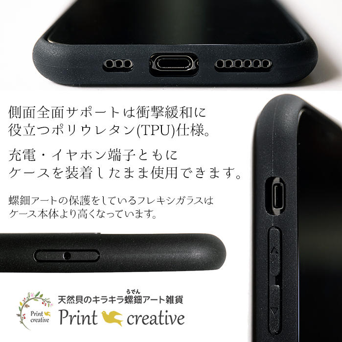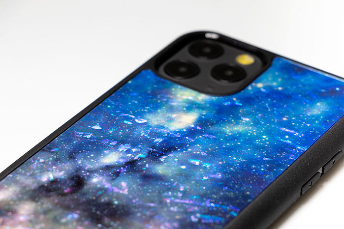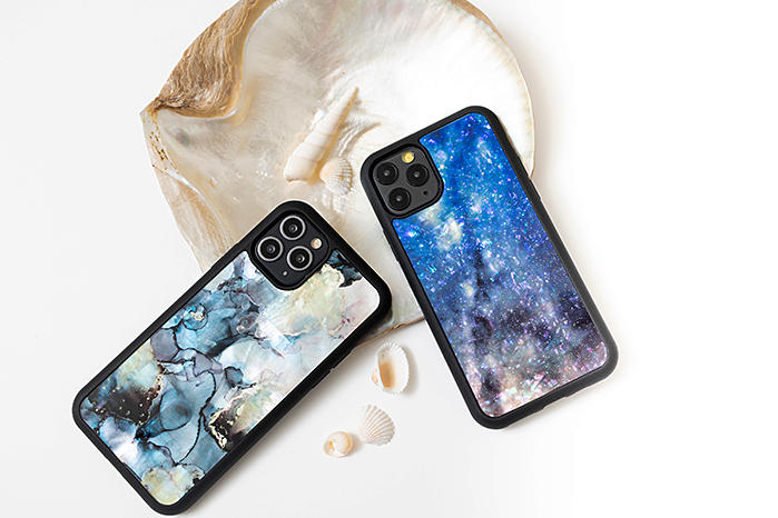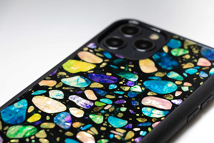 - 貝殻とアートを融合した‟螺鈿アート”というオリジナル技法を使ったスマホケースです。