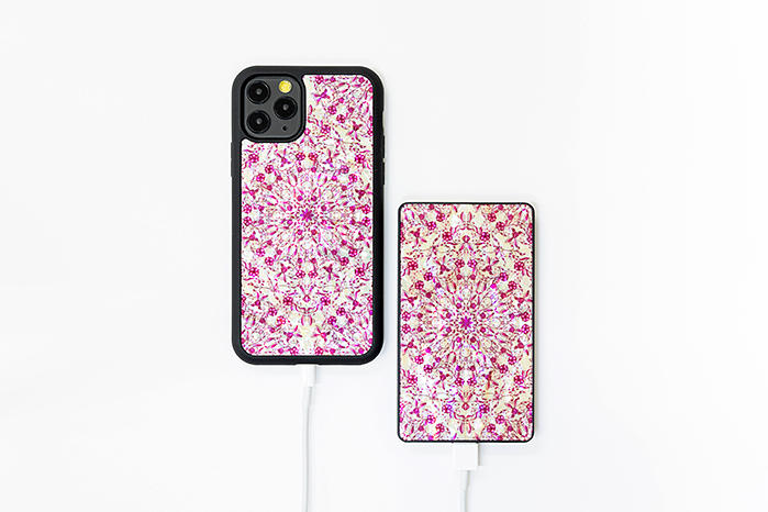 天然貝と貝の保護とともに表面に傷がつきにくい強化ガラスをマッチング。 天然貝のキラメキがより効果的な天然貝×強化ガラスのモバイルバッテリー。