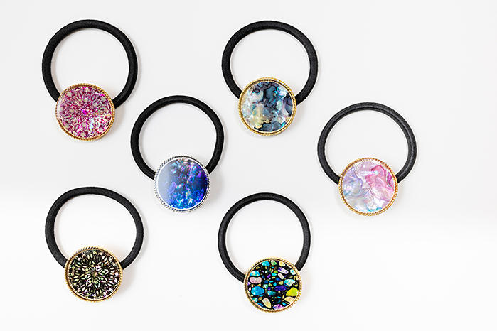 - 貝殻とアートを融合させた‟螺鈿アート”というオリジナル技法を使ったヘアゴムです。