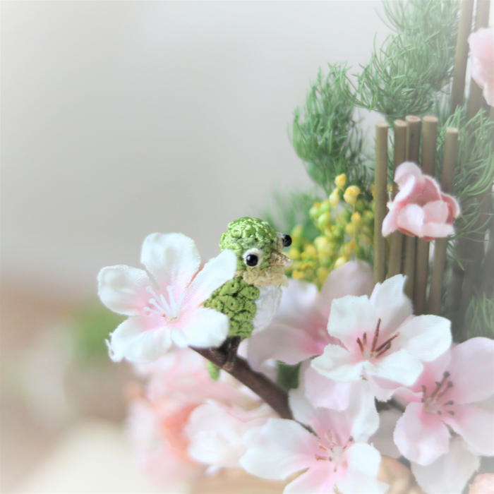 可愛い桜アレンジ。メジロが顔を出して春を感じさせてくれます。