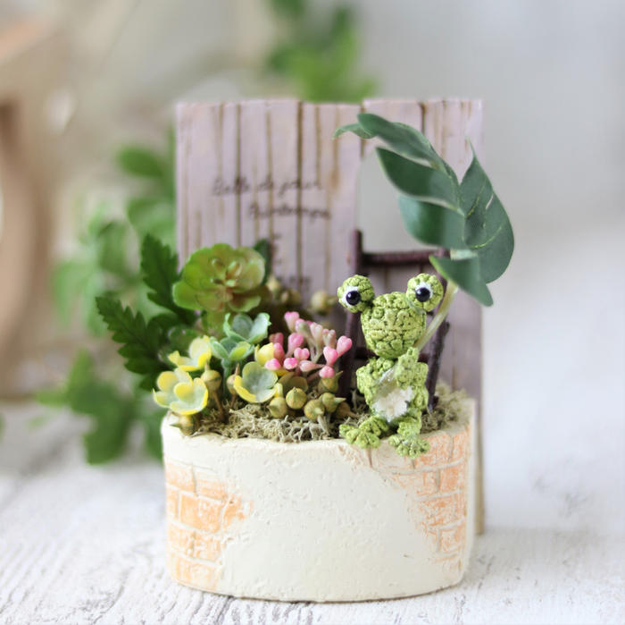 ナチュラルガーデニングに見立てた、手作のカエルと多肉とプリザーブドフラワーアレンジ