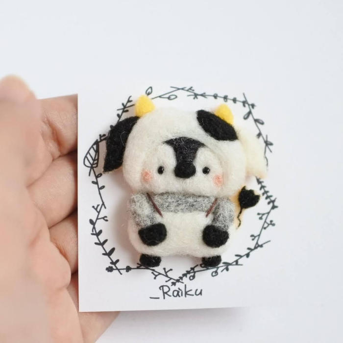ウシ柄のポケットに手を入れてウキウキしたブローチです。