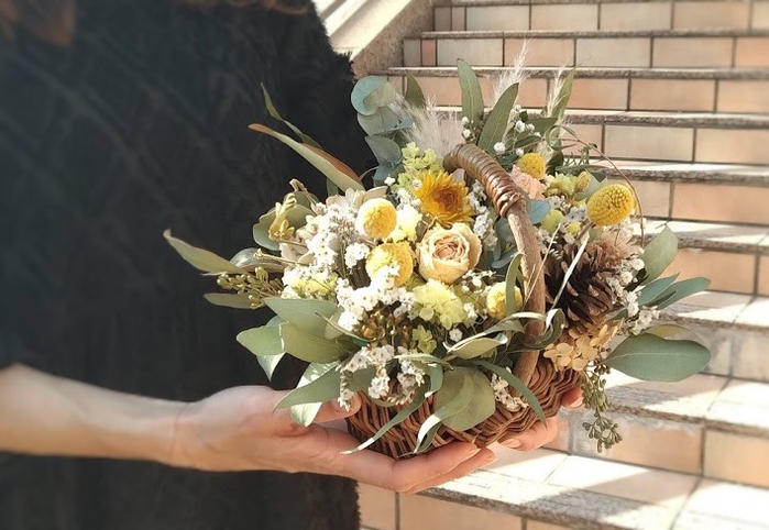 ロスフラワーを丹精込めてドライフラワーに加工し、カゴアレンジメントを作成し1個をお送りいたします。