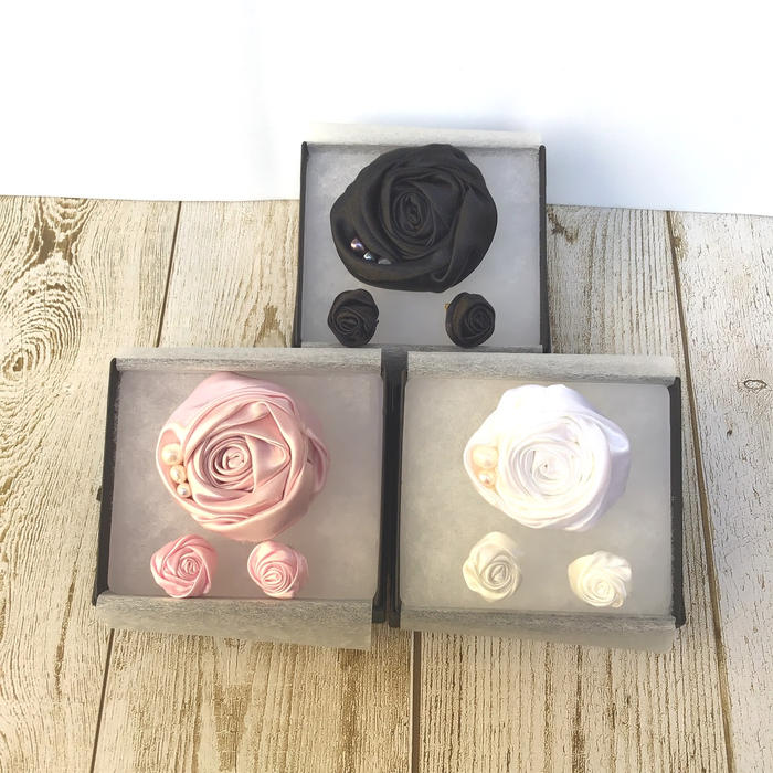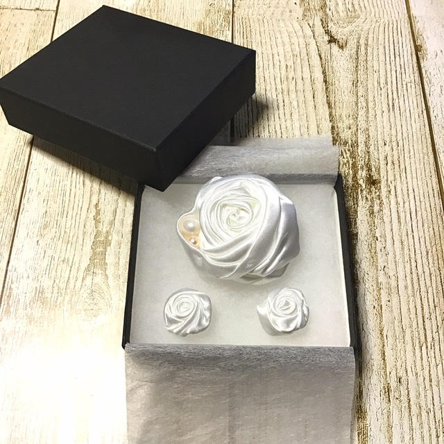 - 薔薇の花びらに淡水パールを巻き込んだコサージュと、同色のミニ薔薇をピアスにしたローズセットです。