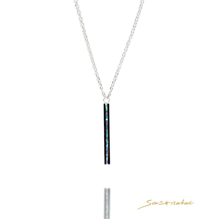 - ⻘⾙が星のように輝き、漆の艶と⾦属が味わい深く変化していきます。⽇本の伝統的な加飾技法である螺鈿を施し、すべて⼀点もののネックレスになります。