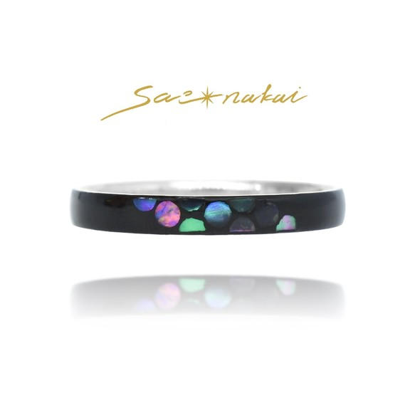 - 満月のような丸い青貝が輝き、漆の艶と金属が味わい深く変化していくリングです。日本の伝統的な加飾技法である螺鈿を施し、すべて一点もののリングになります。