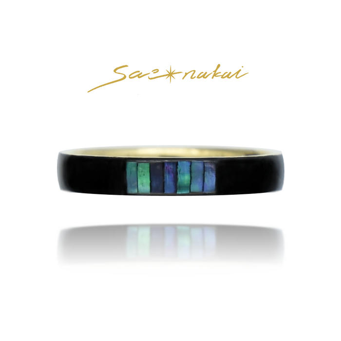 • ⼤きな⻘⾙が星のようにより⼀層の輝きを放ち、漆の艶と⾦属が味わい深く変化していくリングです。⽇本の伝統的な加飾技法である螺鈿を施し、すべて⼀点もののリングになります。