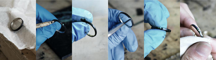 - ジュエリーに用いる金属素材を丁寧に加⼯し、細かな作業を繰り返して、“螺鈿のジュエリー”は完成します。はじめに、⾦属を加⼯し、リングを制作します。なましと呼ばれる、火を通して金属を柔らかくする作業を行い、形を少しずつ整えていきます。漆を金属の表面に施すため、より精度が重要になります。